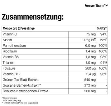 Forever Therm contains many important vitamins, such as vitamins B1, B2, B3, and many more. Two Forever Therm tablets per day are an ideal supplement for your body.
