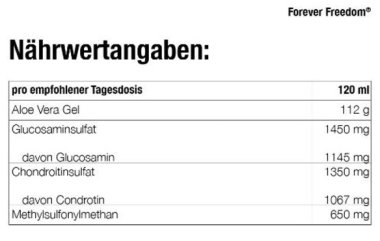 - MSM (Methylsulfonylmethan) – eine organische Schwefelverbindung, die in der Natur vorkommt, etwa in Pflanzen und Früchten. MSM ist bekannt für seine Reinheit und wird in Forever Freedom® als Teil der harmonisch abgestimmten Formel eingesetzt.