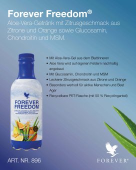 Forever Freedom® vereint hochwertiges Aloe-Vera-Gel mit einer ausgewogenen Kombination aus Glucosamin, Chondroitin und MSM. Diese sorgfältig zusammengestellte Rezeptur macht das Getränk zu einem besonderen Begleiter für alle, die ihren aktiven Lebensstil bewusst unterstützen möchten – und das mit einem angenehm erfrischenden Geschmack von Zitrone und Orange.